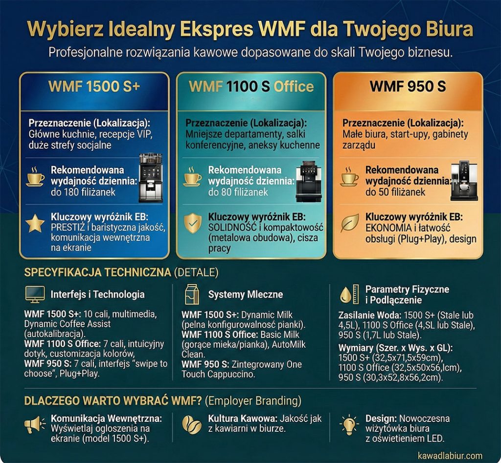 Aby w pełni zrozumieć pozycję modelu 1500 S+, należy osadzić go w szerszym kontekście portfolio WMF dostępnego w ofercie dystrybutorów takich jak kawadlabiur.com. Różne strefy biura wymagają różnych rozwiązań, a optymalizacja kosztów polega na doborze odpowiedniego urządzenia do specyfiki danej lokalizacji.